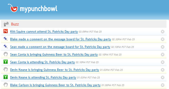MyPunchbowl Buzz will give hosts and guests alike a way to keep track of what’s going on with the party scene as organized through the site. Initially it will consist of the onsite info stream shown below, but there are plans to expand its scope to include RSS, instant messaging, and SMS-based notifications as well. An API will eventually be provided for developers to leverage the Buzz data for whatever purposes they desire off-site.