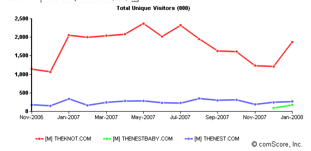 It’s got to do something to drive traffic. TheNestBaby barely registers on comScore, with only 171,000 unique visitors in the U.S. in January, compared to the TheKnot’s 1.8 million (which itself shot up in January after a few months of decline). Maybe print isn’t dead after all. I wonder if we are going to see more Web-buy-print deals, especially in niche media.