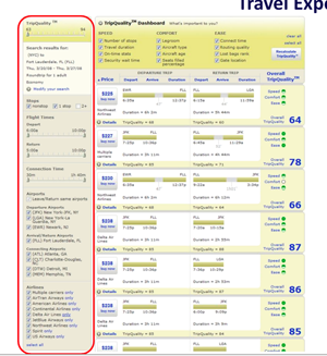Quality is measured by factors spanning 3 categories (speed, comfort, and ease) and addressing 12 so-called “pain points” (such as number of stops, security wait time, legroom, aircraft type, connection time, and gate location). As a user of InsideTrip, you can indicate which of these pain points are most important to you and the service’s algorithms will generate a unique TripQuality score for each ticket result. These can be used in conjunction with the ticket price to find just the right itinerary.