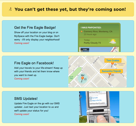“Soon,” though, you’ll be able to send a text message with your location, or use ZoneTags on Nokia 60 phones to broadcast your location automatically. They’ll also release a mobile site for easier text input. There will be a FireEagle embeddable badge that will show where you are. And, finally, they’ll have the mandatory Facebook application to update locations and track friends.