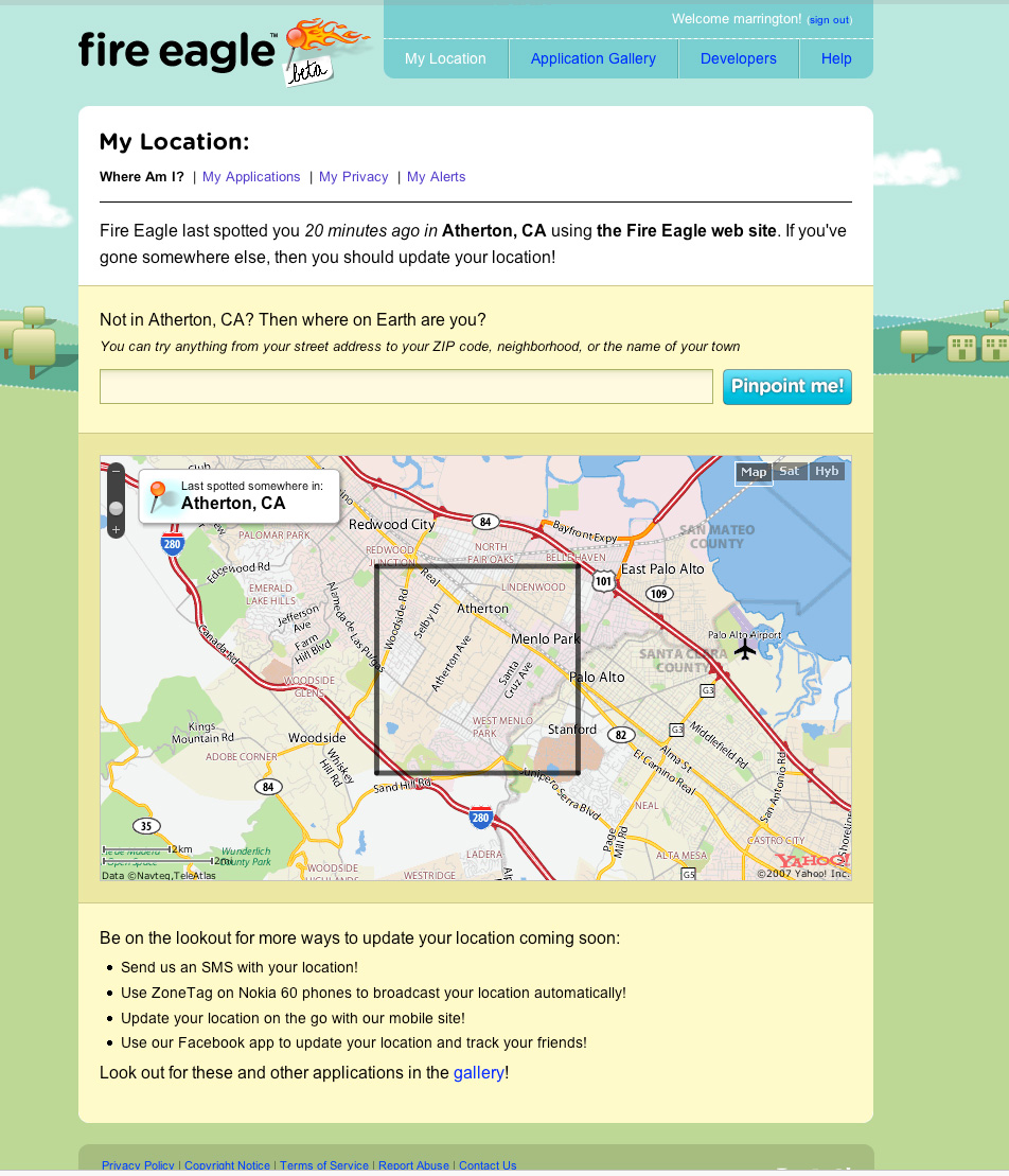 I have big hopes for Yahoo’s new FireEagle platform announced in November 2007. They first described it to me as a Twitter for location. And it does stream your location information in a similar way that Twitter streams short messages. The service opened into private beta today.