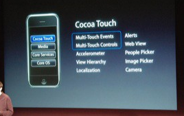 Now Apple is opening up all of its internal APIs and tools for 3rd party software developers. These include a version of the Cocoa programming environment called Cocoa Touch that focuses on the idea of touch as an input. It allows for multi-touch events and controls, use of the built-in accelerometer and camera, and other things like hierarchy views, localization, alerts, web views, people pickers, and image pickers.