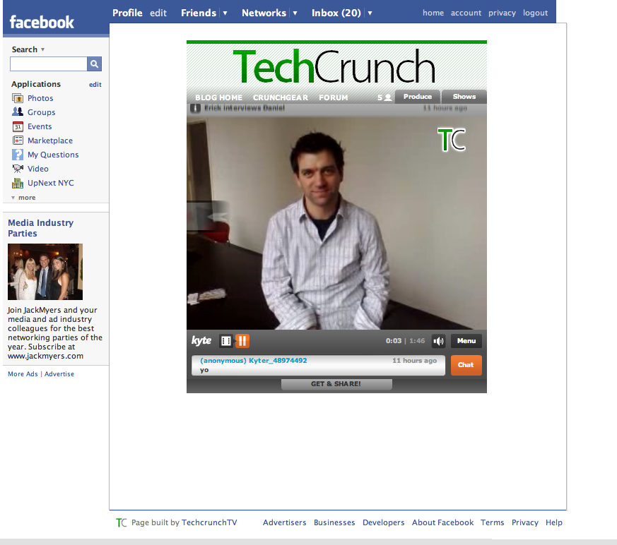 “It doesn’t say “Kyte” anywhere,” says Graf (except that it does, on the bottom left). “This is like a micro Website. It can be virally distributed. Fans feel really connected to it.” They can also contribute. The Kyte player has a “produce” button that lets fans upload their own videos right into the channel. Graf created the one above for TechCrunch (it is the second one ever made after 50 Cent’s). For the next few hours you can add your own video commentary using a Webcam (we will be monitoring this, so please keep it clean).