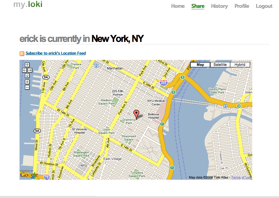 Or you can even create a location feed that anyone obsessed with your whereabouts can subscribe to. This feed integrates with any GeoRSS service, such as Google MyMaps. MyLoki also works with Jaiku and Yahoo’s Fire Eagle. No Twitter integration yet, but that is in the works.