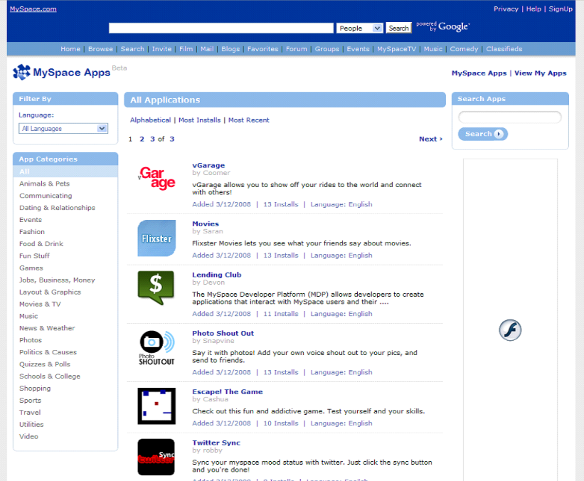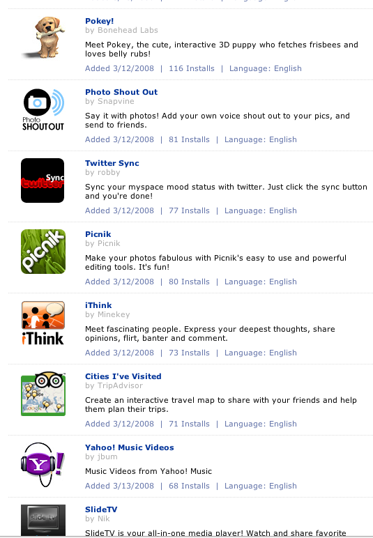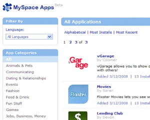 When the platform was soft launched on February 4th, developers were told they had a month to develop their applications before more than a maximum of ten users could install them at a time. Now the user caps have been lifted and an application gallery called MySpace Apps has been rolled out. While MySpace won’t yet promote the gallery, any user that makes his or her way there will find all applications that have been approved for safety, following their terms of service, abiding by their guidelines, etc.