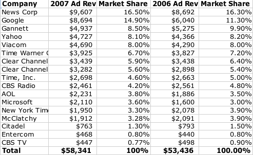 Now, what about absolute market share? Google does pretty well there too, with 14.9% of the total $58 billion represented by all 17 businesses. That is up from an 11.3% market share in 2006, and makes Google No. 2 behind News Corp’s 16.5% market share. (No.3, actually, behind Time Warner, but Blodget separated Time Warner Cable, Time Inc., and AOL, which combined would have a 15.2% market share).