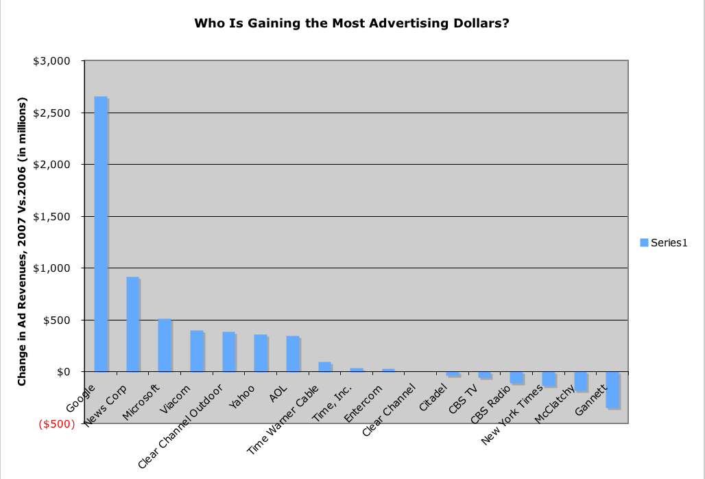 But let’s take a deeper dive into these numbers. Google added $2.6 billion in advertising revenues last year. Next in line and far behind was News Corp., which grew its ad revenues by $915 million. To better visualize how much Google is creaming every other media company, I put together the charts above and below (click on them to see a larger version). And here’s a table with each company’s ad-revenue gains (or declines), in descending order: