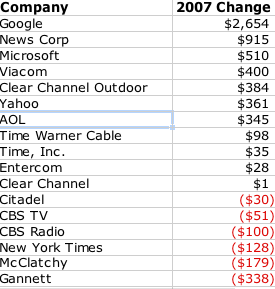 When it comes to market share gains in advertising dollars, Google outstripped every other media company in 2007, whether you look at the Web, TV, print, or radio. Earlier this morning, Henry Blodget compared the advertising revenues of 17 major media businesses (including News Corp, Time Warner Cable, Viacom, Google, Yahoo, Microsoft, AOL,, the New York Times, and CBS Radio). He left out Disney for some reason, but otherwise it’s a pretty good set of data (see the spreadsheet here). According to his calculations, total online ad revenues across these 17 companies grew 9% last year, online revenues grew 28% (versus 3% for offline ad revenues), and Google’s online ad revenues grew 44% (versus 15% for the combined online ad revenues of Yahoo, Microsoft, and AOL).