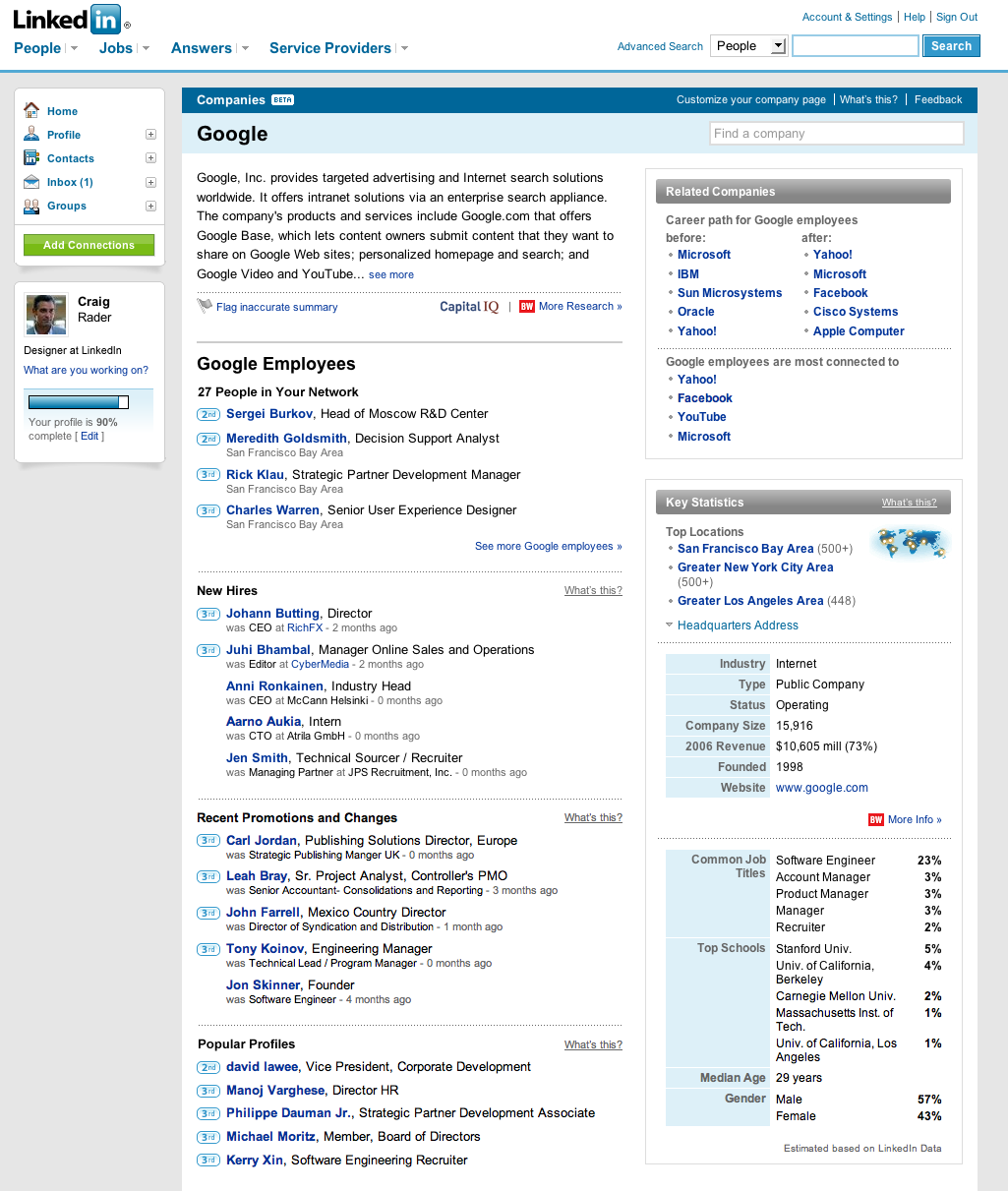 LinkedIn uses this knowledge to display recent hires, related companies, recent promotions, top locations for employees, and so-called “popular profiles” (people who get lots of profile views and mentions in the press). The data has also been used for company comparison purposes. You can see which companies employees usually come from and leave for, as well as which companies the current employees are most connected to.