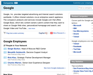 These private pages (you have to be signed in to see them) pull in some information from Capital IQ, a sister company to BusinessWeek, such as company descriptions, industries, types, statuses, headquarter addresses, sizes, founding dates, and websites. Many of the companies to which people belong on LinkedIn, however, aren’t big enough for Capital IQ to recognize them. So the bulk of the data shown on these company pages comes from LinkedIn’s own knowledge of people’s careers.