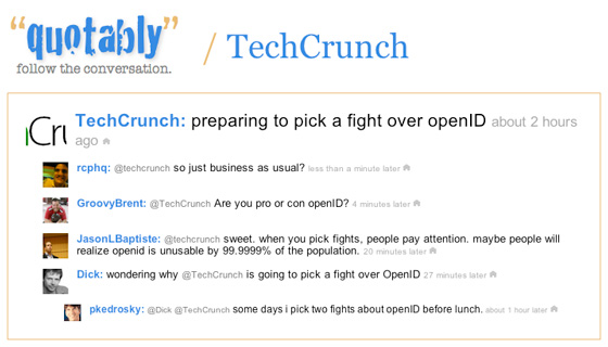 The service is easy enough to use – just tell it a Twitter ID and it will show you threaded conversations that involve that person. You can also view a RSS feed for any Twitter user by simply adding “.rss” to the end of the Quotably URL, such as quotably.com/techcrunch.rss.