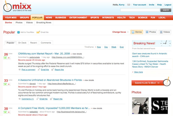 So today they’re releasing yet another new feature. Like the others, it’s worth a little thought. The goal is to get the really hot news up to the home page very quickly and without having to go through the normal vote gathering process, which can take up to 24 hours before a story makes it to the home page. To get this special treatment, A special user, called a Super Mixxer (here’s how you become a Super Mixxer), must tag a story as Breaking. Once a story has been tagged by two Super Mixxers, the story goes to the home page under the Breaking News area. The story will continue to build up votes and move into the general Popular area of the page at that time. Others may drop off entirely.