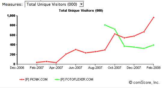 I made the image above in about 30 seconds. (You can play with it here). The tabbed UI is really easy to use, and there seems to be a lot of effects and layers that you can add. I am not so crazy about the animations, but I think those are supposed to appeal more to young girls. All in all, though, the functionality that is available for a Webtop app is pretty impressive and the new features and functionality should make it much more competitive with Picnik. Which one you use now is really just a matter of personal preference. (FotoFlexer is more tightly integrated with Photobucket, Picnik is baked into Flickr). I like Picnik. Mike prefers FotoFlexer. But as the traffic graph below shows, more people agree with me.