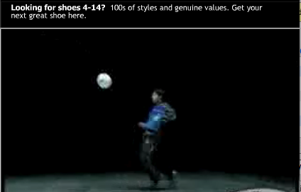 Yesterday, blinkx CEO Suranga Chandratillake dropped by my office and we got to talking about video ads. Blinkx is a video search engine, but it is also building a video ad network called AdHoc that attempts to place contextually-relevant, clickable text ads in a bar above the Web video being watched. For example, in the screen shot of the soccer video above, you will see a text ad for shoes. YouTube is doing something similar with its new AdSense for Video ads. The ads themselves don’t have to be text. They can be banners or logos that pop up, or even new videos-within-a-video under the control of the viewer. The point is that they exist within the main video itself, not after or before it. And they appear briefly at relevant points during a show.