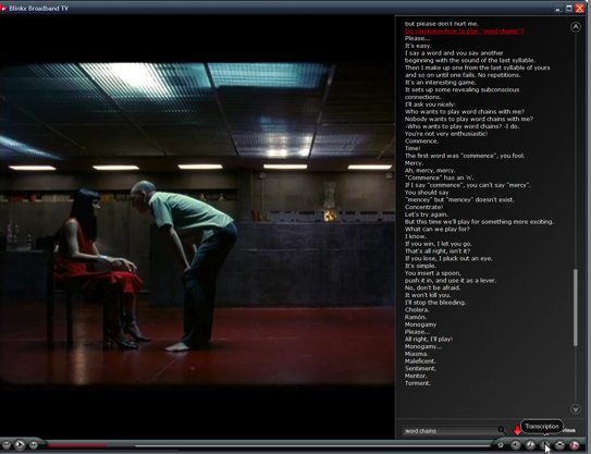 Where he tries to be different is with the technology and the experience. With BBTV, you can stream full-length movies to your PC in decent quality. Using Blinkx’s speech-to-text technology, you can see a full transcript of any video and go to that exact part of the video by clicking on any word. “Speech becomes navigation,” says Suranga. You can also jump off to the regular Web by hitting different key strokes to, say, search for a person’s name on Wikipedia or look up something on IMDB.