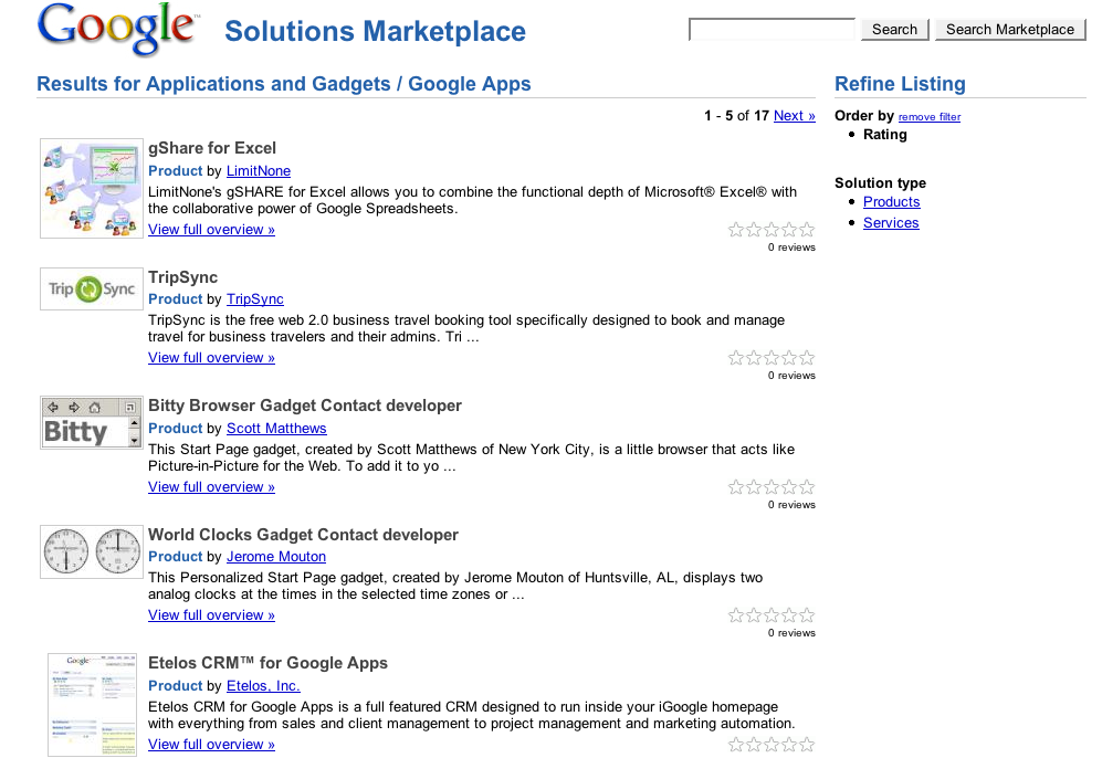 Google is calling its exchange the Google Solutions Marketplace. It replaces a simpler Enterprise Solutions Gallery that Google had before. While Google won’t be hosting the apps (it is just a free listings service), companies can create their own product profiles. Customers can search for Google-related enterprise apps all in one place and rate them. Google needs to create momentum around its enterprise products so that smaller companies will want to develop add-ons and create businesses around them. Right now the offerings seem pretty thin. There are a bunch of syncing tools, identity management offerings, add-on gadgets, and integration with other enterprise apps. But what is lacking is an economic model that would really motivate developers to build on top of Google’s Enterprise apps. The free exposure, though, is a start.