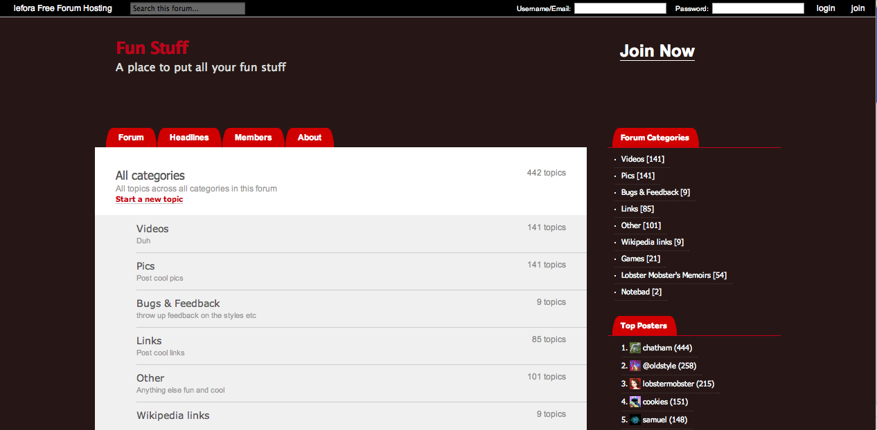Lefora also surfaces the hottest topics and most recent activity on a special homepage, in addition to providing the standard structural overview of a forum. Membership to one Lefora forum can be easily extended to membership of another, since all of them access the same user base.