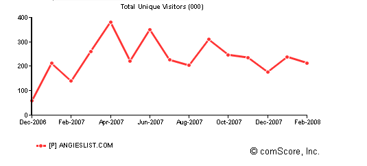 Angie’s List was founded in 1995, and provides users with customer reviews on a variety of services, including plumbers, roofers, and handymen. The site has over 600,000 members in the United States, and it soon plans to expand abroad. Users must pay a fee starting at $35 a year to access content, but free trials are granted for a year in cities that have been added to the site recently. According to comScore, its traffic has been flat, with only 214,000 unique visitors in February.