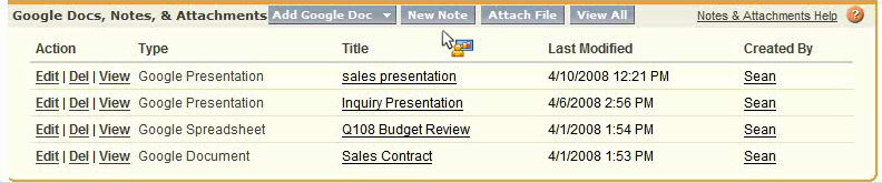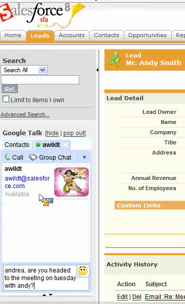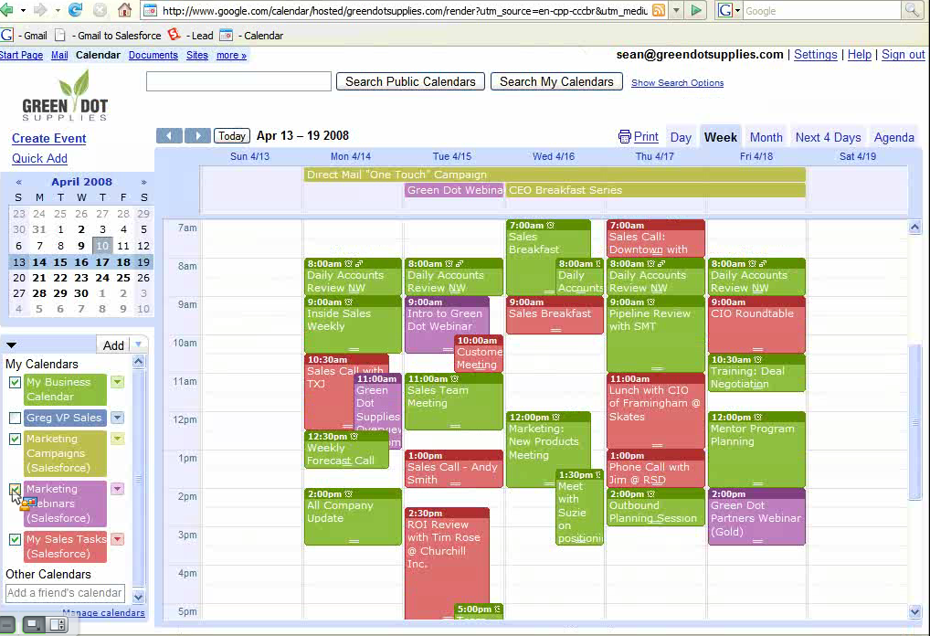 Google is in effect becoming Salesforce’s productivity suite. Google documents, spreadsheets, and presentation can be created from within Salesforce’s CRM application. GTalk works as the de facto instant messenger within Salesforce. With one click, sales people who use Gmail can send any email correspondence with potential or existing customers to Salesforce, where it becomes recorded as part of the sales cycle. Sales events and marketing campaigns can be overlayed onto a Google Calendar (see screen shot below), as well as colleague’s schedules for figuring out convenient meeting times.