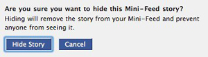 Much of the problem stems from what seems to be a poorly worded notification box that appears when a user deletes a story from their own profile. Upon clicking the ‘x’ next a story, a dialog appears that says, “Hiding will remove the story from your Mini-Feed and prevent anyone from seeing it.” The statement seems to indicate that the item is permanently hidden from everyone’s view, but this isn’t the case. It might not show up on your profile, but your friends will still know about it, compliments of their News Feed homepage.