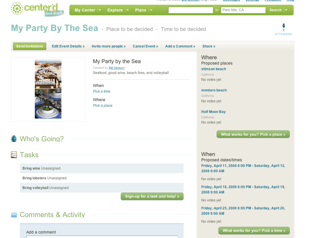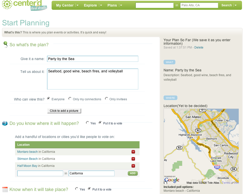 Center’d is both a local search engine and an event-planning application. You can search places for restaurants, hotels, schools, museums, stores, etc., and the results appear on a Google map. There is also a calendar view. Once you connect with friends on the system their events pop up in your searches. And you can also create your own events and get your friends to help decide the details. For instance, things like the location and date can be voted on. Want to have a party by the sea? Ask your invited guests if they’d rather go to Stimson Beach or Montaro Beach, and if next Sunday is better than this Saturday. You can also assign tasks for them to sign up for: bring lobsters, bring wine, bring volleyball.