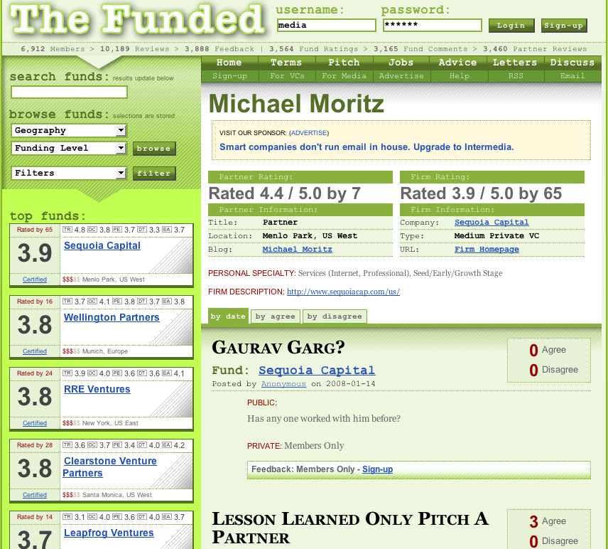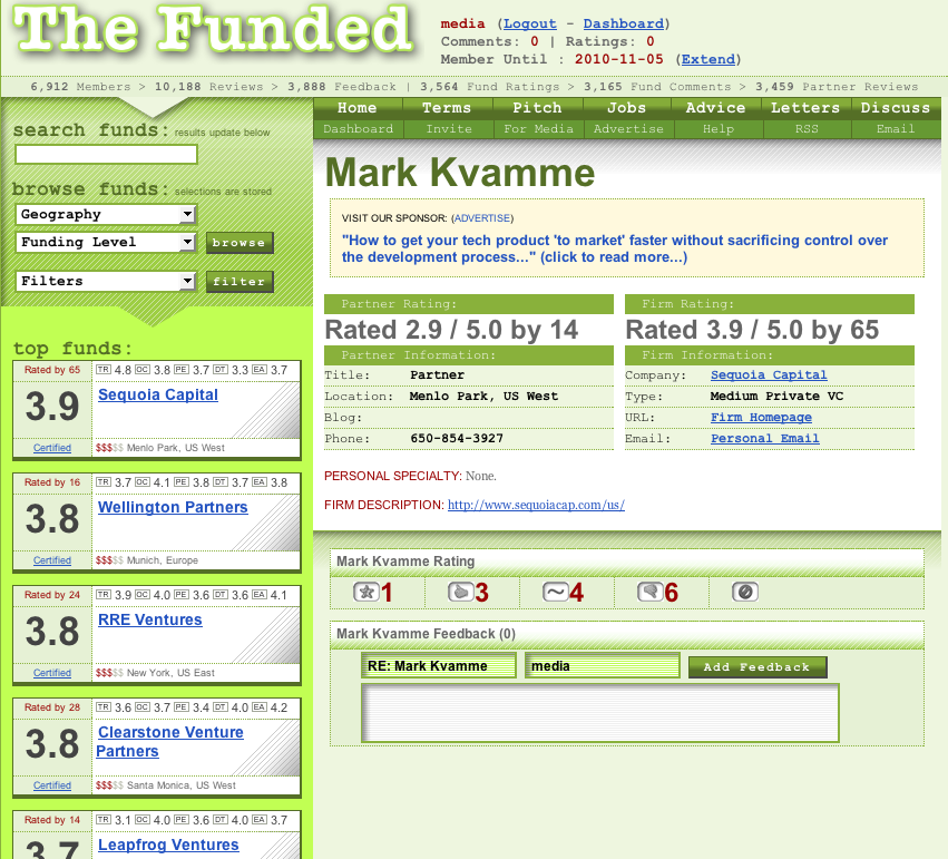 Up until now, if you wanted to see the ratings of individual venture capitalists on TheFunded, you had to be an invited member, which meant that you had to be the CEO or founder of a company (or pay $200 for six months access and prove that you are a senior adviser or consultant). But now anyone who visits the site can see the ratings for 17,000 individual VCs without logging in (before only the ratings for entire VC firms were publicly available). Only members can rate VCs.