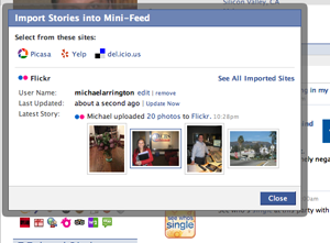 As we predicted in February, Facebook has opened up the Mini-Feed so users can import updates from other web services, starting with Flickr, Picassa, Yelp and Delicious.