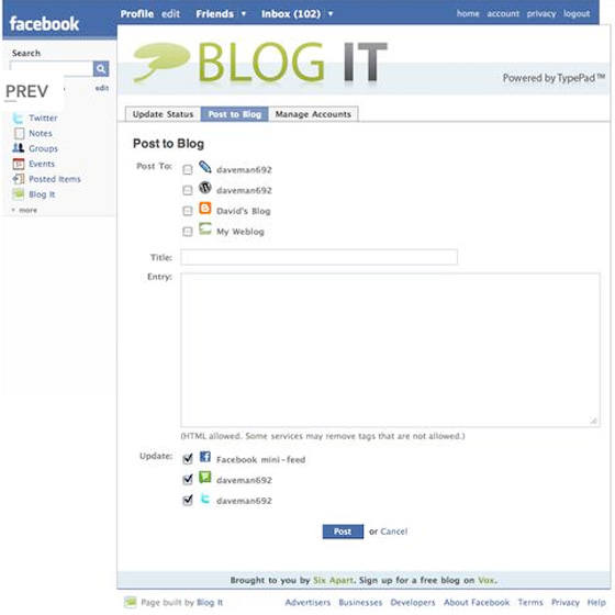 Blogging startup Six Apart launched BlogIt tonight, a Facebook blogging tool application that lets users quickly post to their blogs and then send notifications of the post to various social networks.