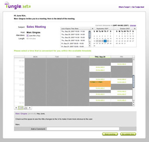 The invitation system is key. Tungle users can invite non-Tungle users by sending them a link to a special coordination page. This “Tungle Space” page shows your availability and solicits their input for when they are also available. If your schedule changes after sending out the invitation, the Tungle Space page will update itself accordingly. And you can use it to invite multiple people to the same meeting. As people visit the page and indicate when they are available, the options get narrowed down until the last invitee to respond chooses a time.