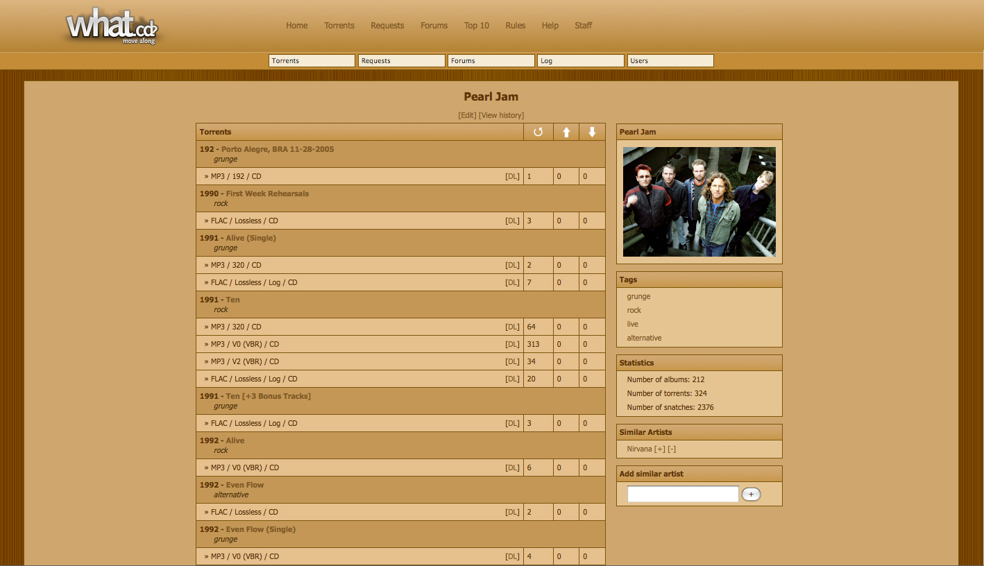 BitTorrent tracker What.cd launched Gazelle last night (beta), effecting a complete re-launch of sorta. There’s a new site design (though still with the familiar wood theme) and some new features. One of them, Paranoia, lets users set how much info is available to other users of the site. Things like recently snatched torrents, current seeding/leeching and other stats can now be regulated. There’s tags, wikis, related artists, etc.
