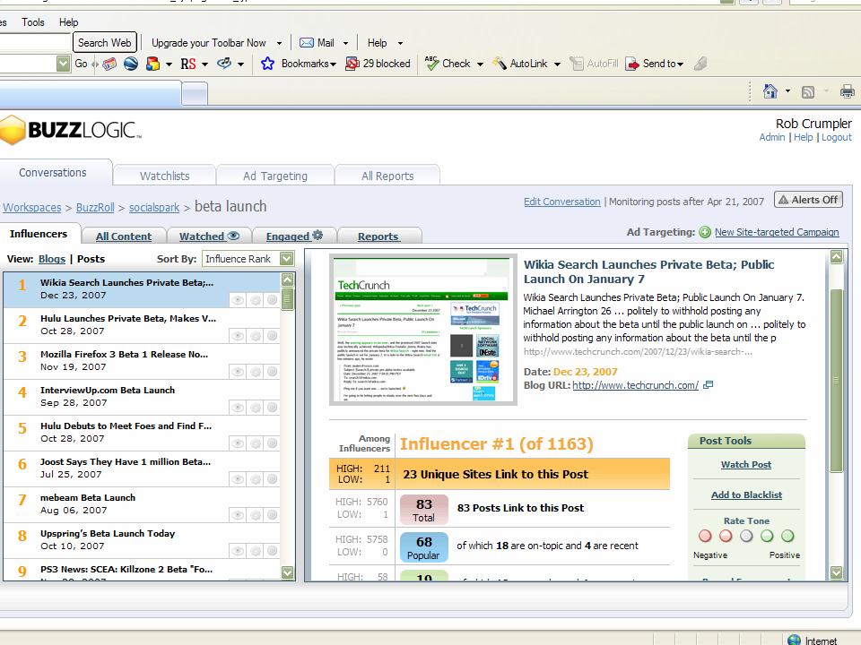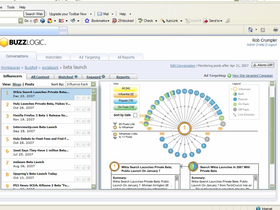 Already, BuzzLogic is used by marketers to try to figure out who is influencing the conversation about their brands and their competitors. (Much like Nielsen BuzzMetrics, Scout Labs, and Visible Technologies). The subscription service ranks the most influential blogs on any topic based on a dozen factors, such as how many other blogs link to the first blog and how popular the linking blogs are. It is like Techmeme for marketers but subscribers can actually see the rank of each blog and how they are connected to other sites. They can also purchase AdSense ads on the most influential blogs from inside BuzzLogic.
