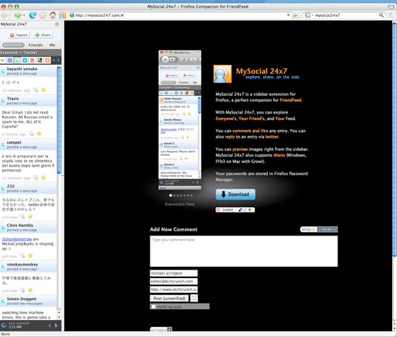 MySocial24x7, which launched early Tuesday morning, is a Firefox extension that allows users to access most FriendFeed functionality via their API directly from the browser sidebar.