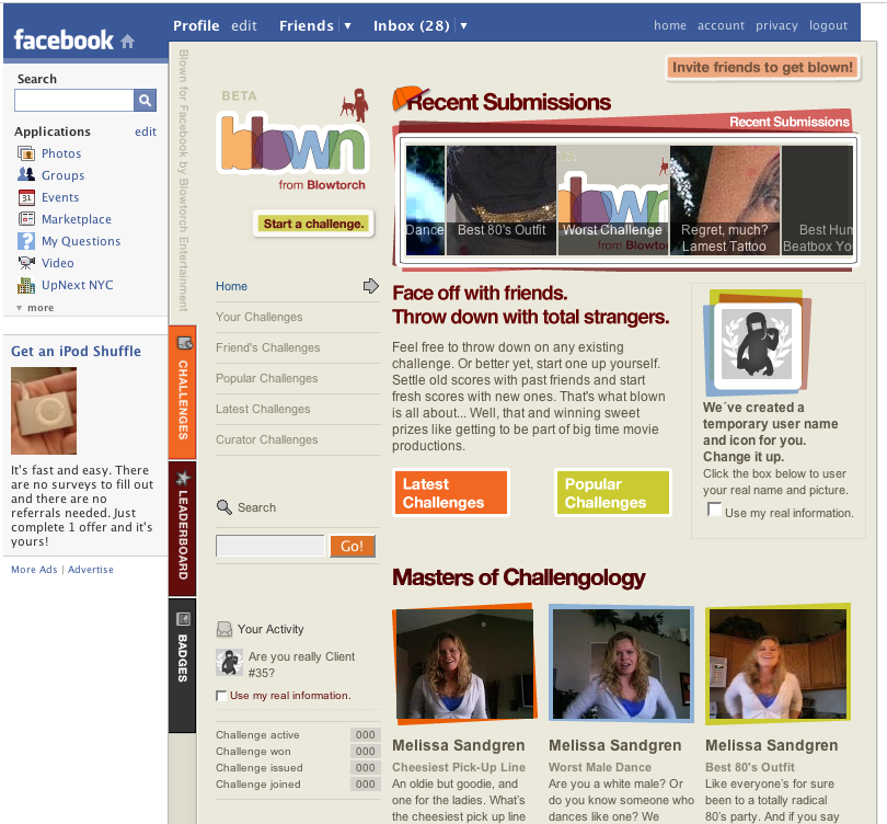 Blowtorch makes feature-length independent films, and is shooting one right now in Philadelphia with Luke Wilson called Tenure. But it also tries to engage with its potential college audience online through its Website, and now on Facebook. For instance, anyone can create their own short videos and the best ones get re-shot with professional actors by Blowtorch and will be shown before its main features in theaters across the country. Now with Get Blown, the idea is to get this audience to issue video challenges to each other. Right now, it is only a Facebook app, but Bebo and mobile versions are coming soon.