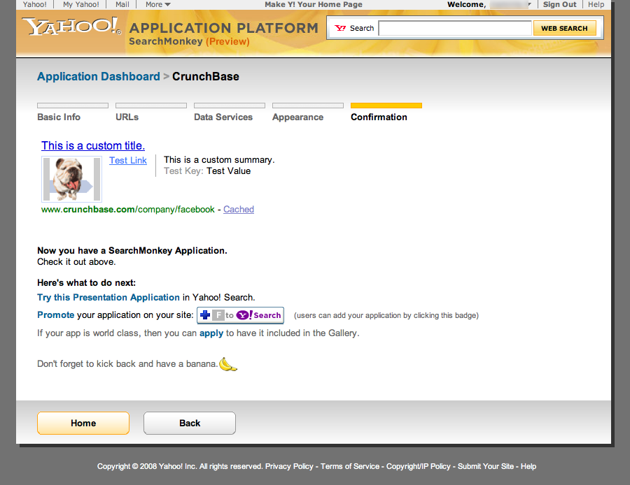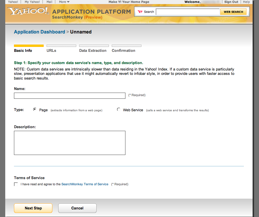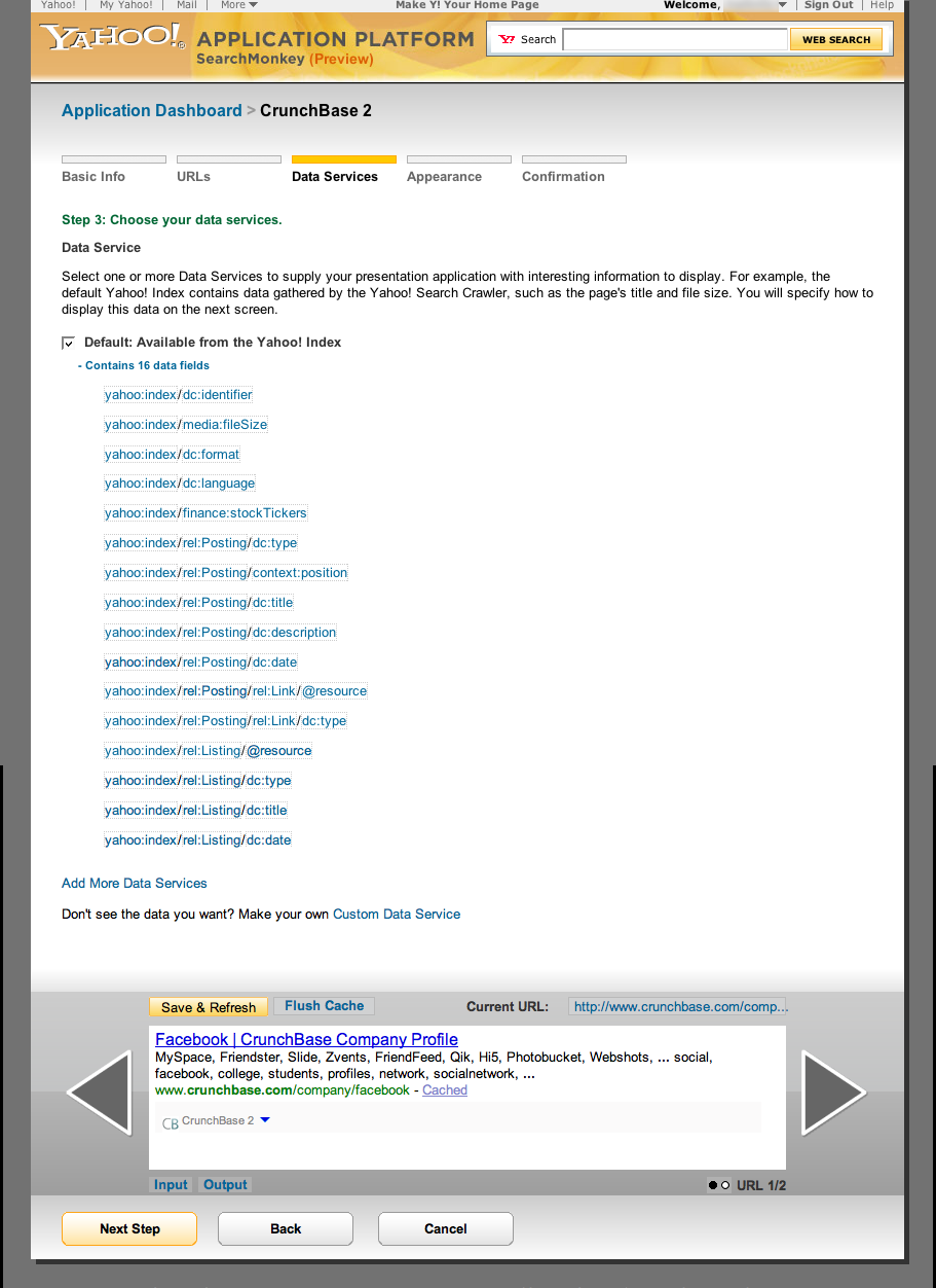 But you want to pull information from the page being listed as a search result so users can get a taste of what they’d learn by clicking through. So you’re going to have to somehow inform Yahoo of this information. That requires creating a “custom data service”, which is a multi-step process in and of itself that I describe below.