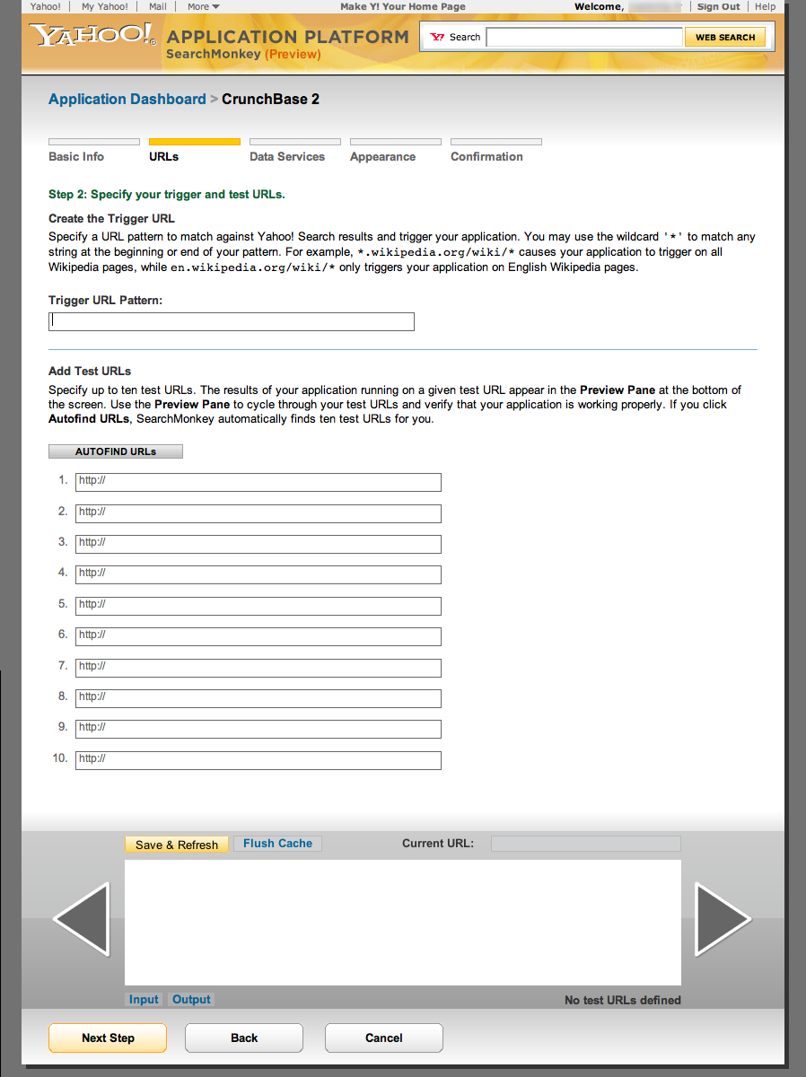 Once you set those basic settings, you need to indicate the URL structure that your application will target. The structure looks something like *.crunchbase.com/company/* where the asterisks allow wildcard matching at the beginning and/or end of your URL pattern. That example pattern would be used to customize search results for all company pages on CrunchBase.