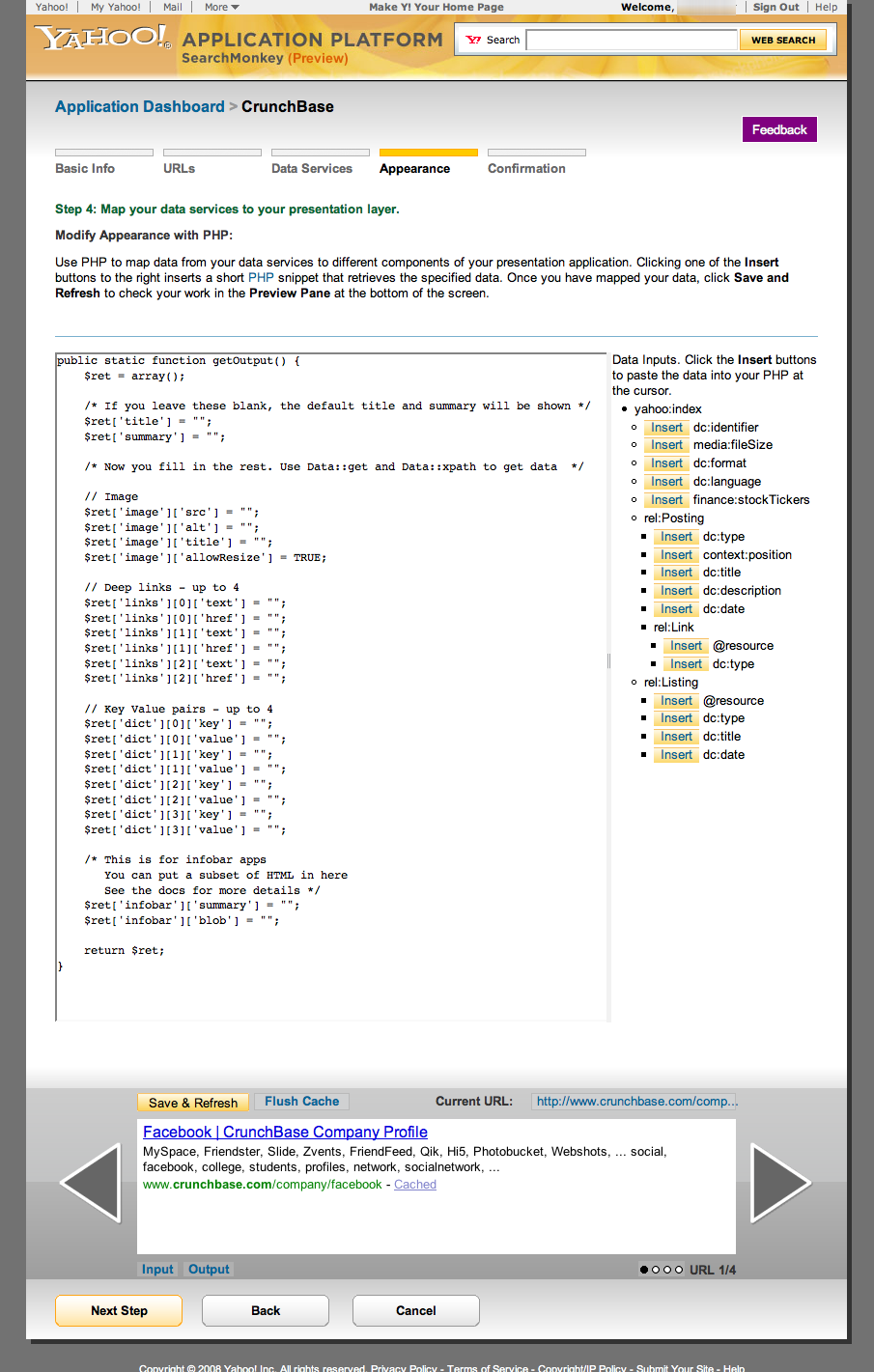 For a second, though, assume that you’ve already created a custom data service. All that’s left is to tell SearchMonkey how to display the custom data, which consists of setting values in a simple PHP class. You can set up to 4 deep links (restricted to your own domain) and 4 key/value pairs. As you play around with the appearance of your result, you can preview it at the bottom of the page by clicking “Save & Refresh”. This gives you constant assurance that you’re actually doing things right (always a good thing).