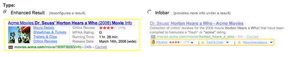 There are two possible types: enhanced results and infobars. Most site owners will opt for the “enhanced result” option, which can display a bunch of information in full view as the Yelp example above does. The “infobar” option condenses supplementary information into an interactive bar below each search result. Users need to engage with it to reveal more information, but apparently it provides more flexibility in terms of HTML and styling (I couldn’t get it to work in my tests).