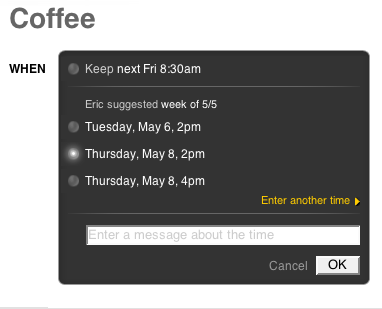 The home page is a plain, Google-inspired box. But instead of typing in what you are looking for, you type in what you want to do and with who: “Coffee with Eric in SF,” “Movie with Nadia Fri night,” “Meeting with Henry at 2:30 pm.”
