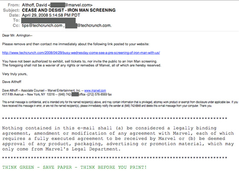 Marvel has sent us a cease and desist letter demanding that we cancel the Iron Man event tomorrow at the AMC Metreon in San Francisco. We are not canceling the event yet – stay tuned as our lawyers work this out.
