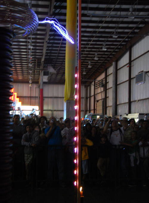 The Nevada Lightning Laboratory made these for Maker Faire, and smartly turned the terrifying viewing in to a picnic lunch by using the power of electricity to zap a couple hot dogs into delicious submission. They want to build a pair of these ten times bigger, inside which an observer could stand and measure whatever phenomena manifest in the middle of a lightning storm. Shocking.