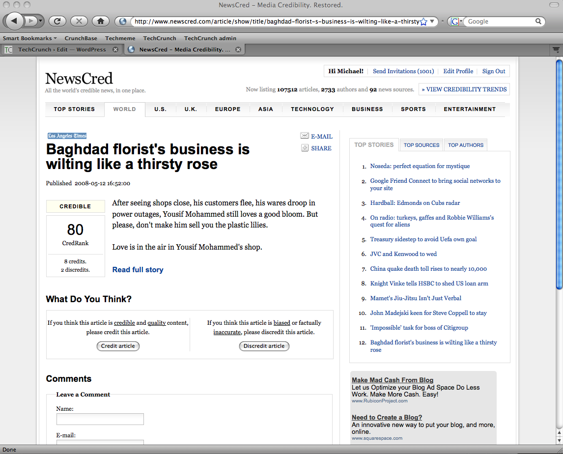 NewsCred has a good idea. Both online blogs and the mainstream media are full of unsubstantiated rumors, biased articles, and unsourced facts. But a black-and-white voting system doesn’t seem to be the best way establish an author’s reputation – the system will rapidly devolve into little more than a popularity contest. In order to succeed, NewsCred will need to establish a robust rating system that encourages fact-based debate. Otherwise, it won’t have much credibility itself.