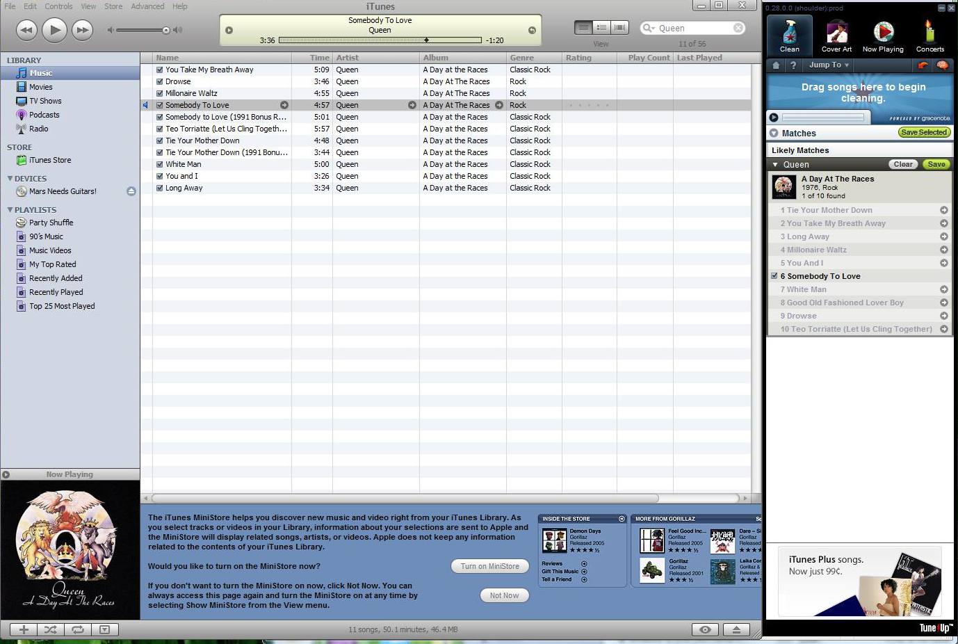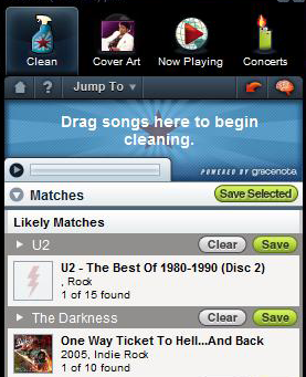 The interface is simple and intuitive. Upon launching iTunes, a sidebar appears with four tabs labeled “Clean”, “Cover Art”, “Now Playing”, and “Concerts”. TuneUp’s biggest draw are the Clean and Cover Art tabs, which utilize the Gracenote database. To use each, the user simply selects a batch of songs and drags them to the appropriate field. Each song is quickly analyzed, and the program presents a number of possible matches for the user to either apply or discard.