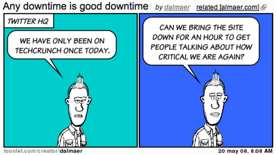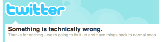 Wow, somebody’s listening. Actual communication is so welcome: “We caused a database to fail during a routine update early this afternoon. We switched to a replica and expect this recovery to take place quickly.” What would be great is if Twitter just moved their blog to another platform so that it doesn’t fail when users need it most.