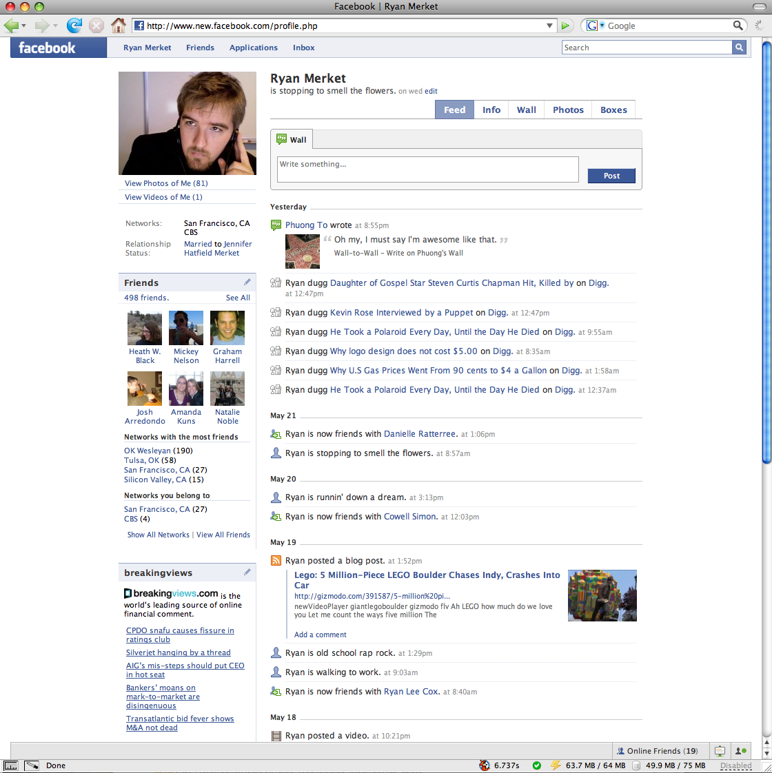 Eagle-eyed TechCrunch reader Ryan Merket (above) noticed something vaguely familiar about the new design. See the menu bar above his profile? Look closely. Its got some handy menus on the left that take him to his profile, his friends, applications, and inbox.