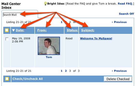 I’ve been testing the new feature for a few days on my MySpace page. Instead of scrolling through pages and pages of messages, users can now sort by date, from, status (read/unread) or subject. And, more importantly, users can also search the full text of messages. The results are shown instantly (think Outlook), without page refreshes.