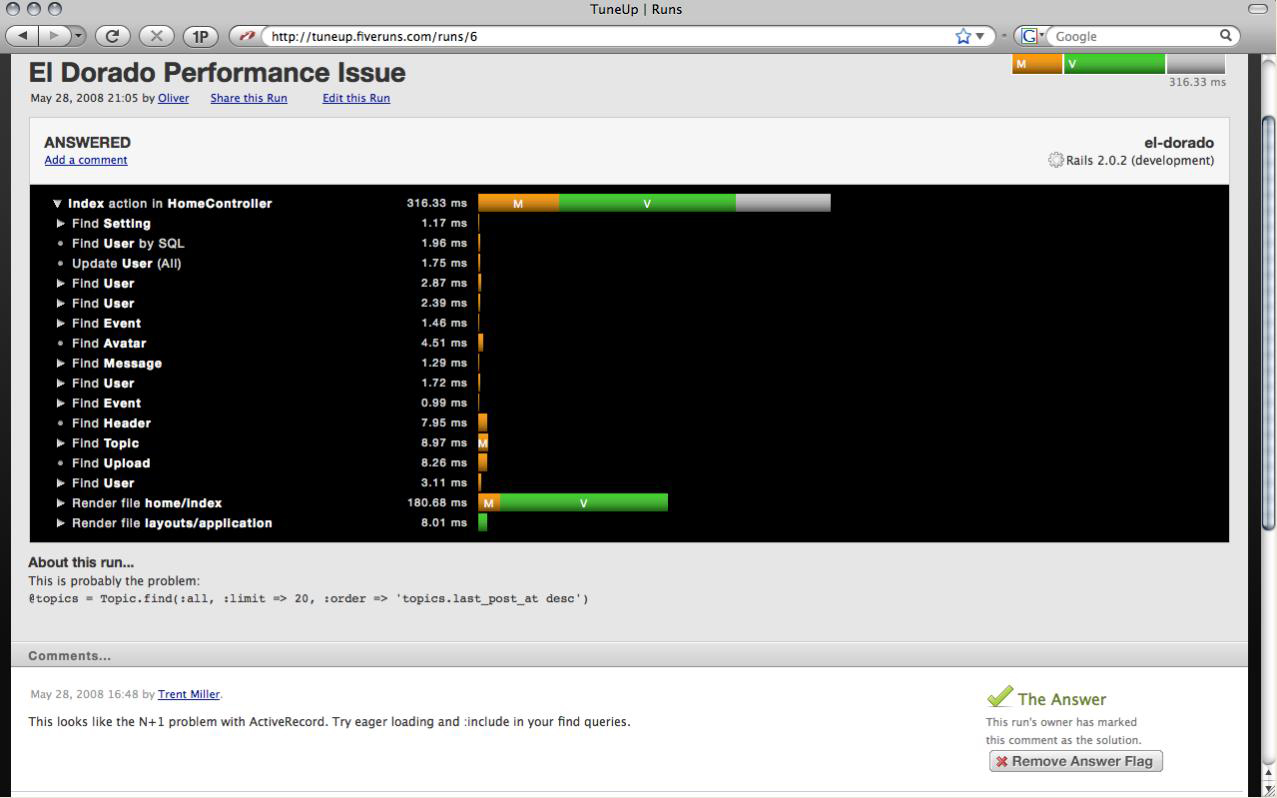 But debugging is not always so simple, so TuneUp does something sorely needed in a world dominated by Google searches for programming answers. A reporting mechanism sends your reports to TuneUp’s site for review by others. Each report, or “run”, contains your complete Rails configuration, the entire execution path of a request, and the overall execution time. When you publish these runs, other programmers and team members can diagnose your problems and offer potential fixes.