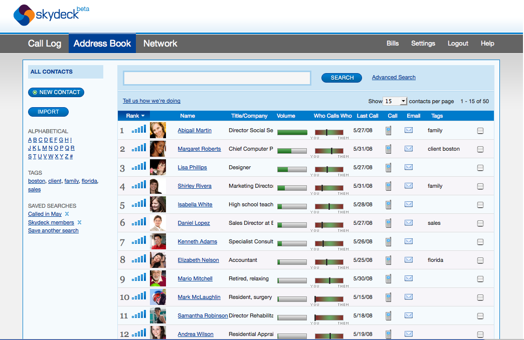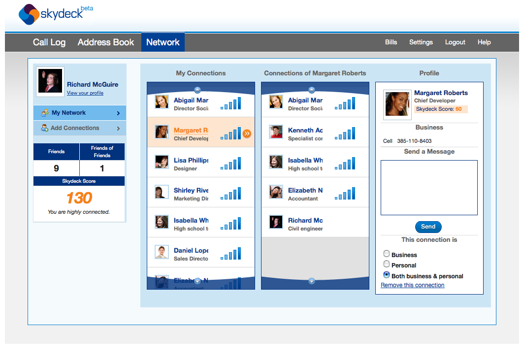 But starting today, members can opt in to connect their social networks with other friends who are also using Skydeck. What makes this interesting is that they can see the strength of their connections to each friend, as well as how strongly connected their friends are to other people. Skydeck measures the strength of a relationship based on the frequency and volume of calls between two people, how recent the calls were, and whether the calls were reciprocal or one-sided. Skydeck rolls up all of this data and represents the overall strength of a relationship as rising signal bars.