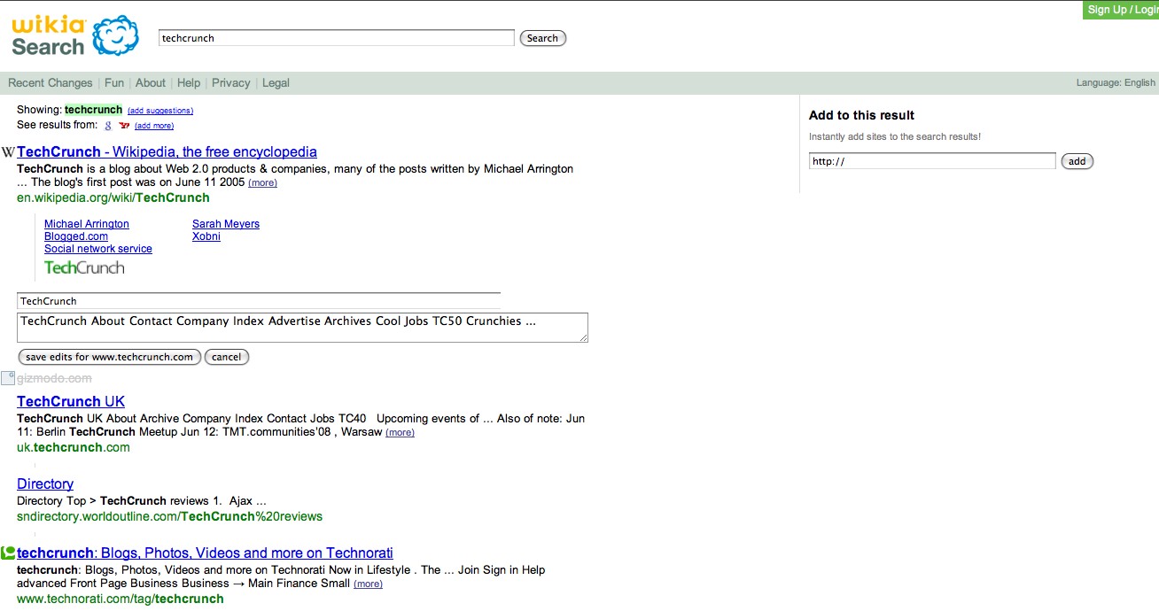 We agree. But today, Wikia Search is beginning to suck a lot less. It has only indexed 30 million Websites, but it is finally rolling out a set of editing features that lets searchers reorder, add, remove, rate, annotate, and comment on results. It also makes it easier for anyone to try to game the search results. Although, as with Wikipedia, an spammers can be banned by the community. We should see some fierce edit wars on this one.