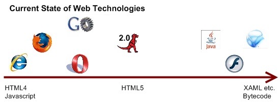 We are back in 1996 again and HTML5 is the new HTML 3.0, but instead of two major browser manufacturers today there are numerous parties with interest in determining what the new web API and virtual machine will look like. In the 1990’s version of events, the open standards eventually won over – which both Microsoft and Adobe have recognized as they have released source code and API details for some parts of their platforms.