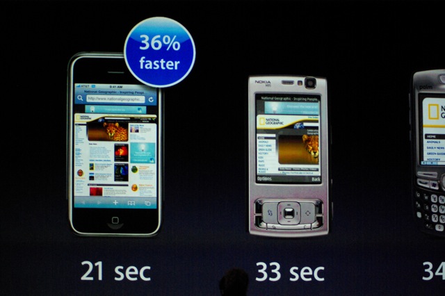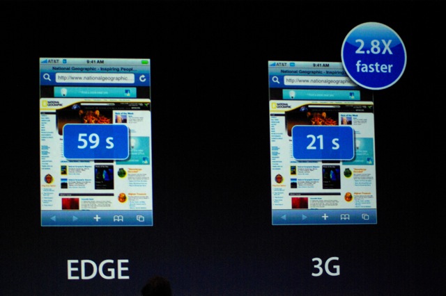 10:34 – Thinner at edges. Same 3.5-inch display. camera. flush headphone jack.dramatically improved audio. feels better in your hand. Faster data downloads. 21 seconds do download website in 3G. 59 seconds on edge. 3G 2.8x faster.